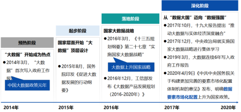 爆发期(2013年-2015年):大数据迎来了发展的高潮,包括我国在内的世界各个国家纷纷布局大数据战略。2013,以百度、阿里、腾讯为代表的国内互联网公司各显身手,纷纷推出创新性的大数据应用。2015年9月,国务院发布《促进大数据发展行动纲要》,全面推进我国大数据发展和应用,进一步提升创业创新活力和社会治理水平。